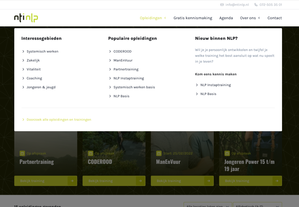 Een frisse uitstraling en een betere SEO-score, daar gingen we voor. Er werd ook gekeken naar de User Experience en Flow op de site, we willen dat gebruikers gemakkelijk kunnen zoeken en filteren op trainingen, geprikkeld worden met uitgelichte trainingen en de juiste informatie krijgen voordat ze zich inschrijven voor een training.