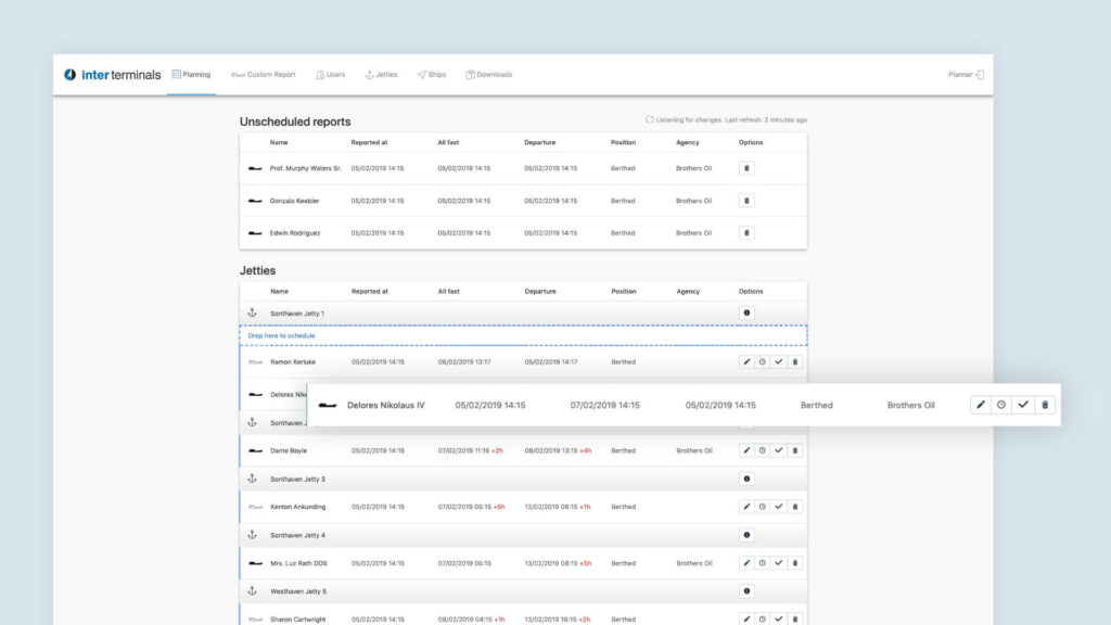 Inter Terminals beschikt in Amsterdam over negen jetties ofwel plaatsen waar schepen kunnen aanmeren om hun lading over te slaan naar een bulkopslag. Om het overzicht te houden over de capaciteit van de verschillende jetties en schepen die zijn ingepland om aan te leggen bij een van jetties zocht Inter Terminal een online oplossing voor hun planners.
